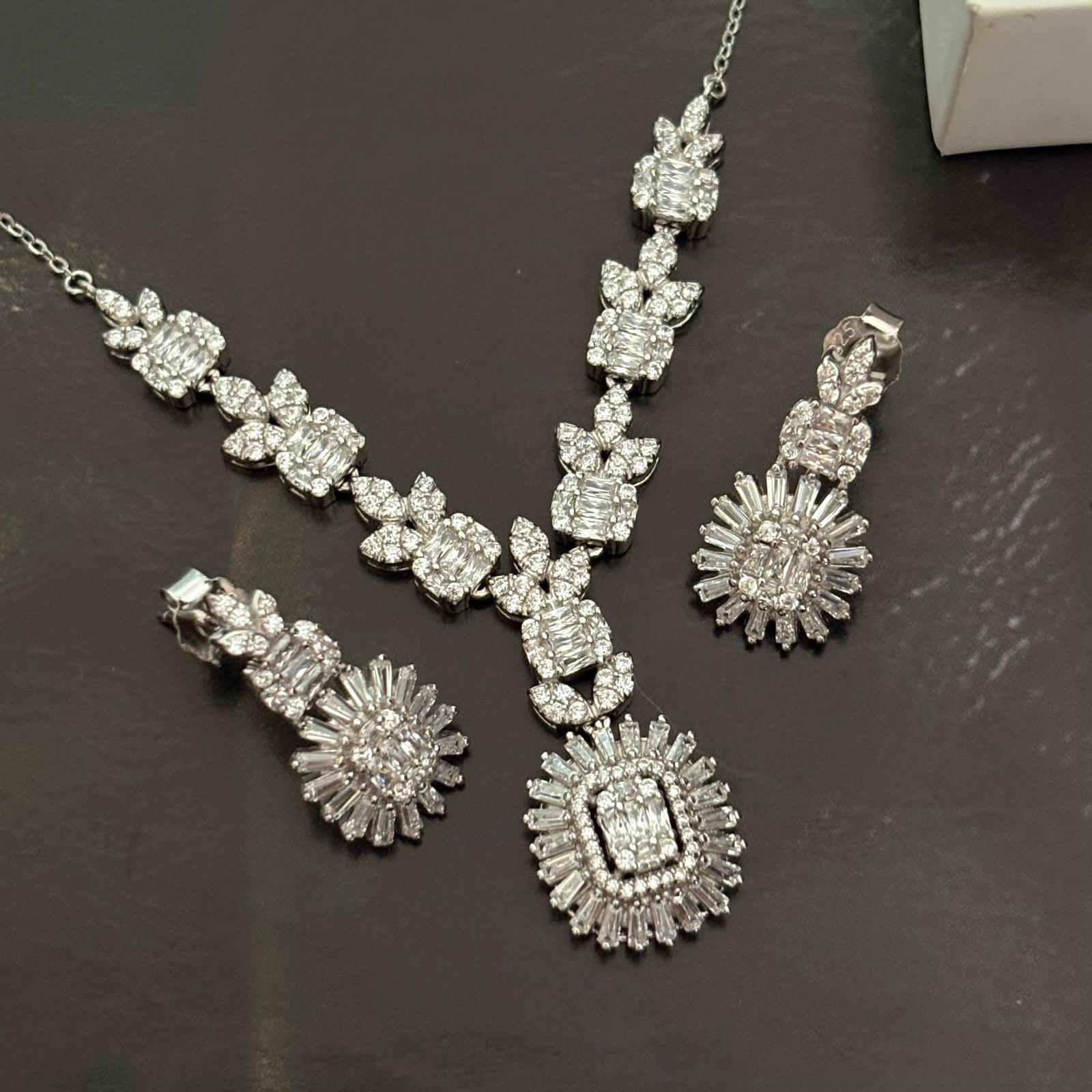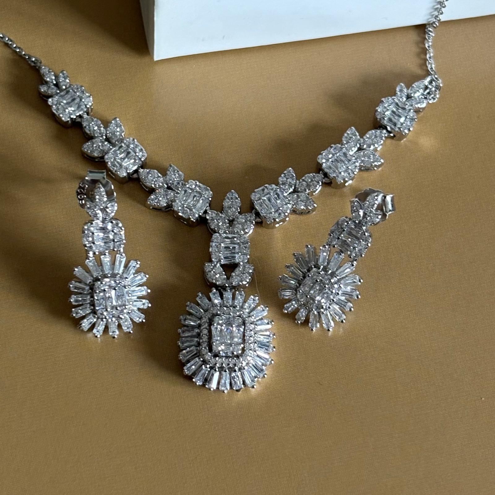 Gerçek gümüşün asaletini pırlanta ışıltısıyla birleştirdik. Tamamı 925 ayar gümüş olan bu set, modern baget kesim taşları ve floral (çiçeksi) detaylarıyla göz kamaştırıyor. Üzerindeki özel kaplama sayesinde beyaz altın görünümü sunarken, kararmaya karşı ekstra dirençlidir. Hem günlük şıklığınızda hem de en özel davetlerde güvenle kullanabileceğiniz bu gümüş takı seti, kalitesiyle yıllarca size eşlik eder.