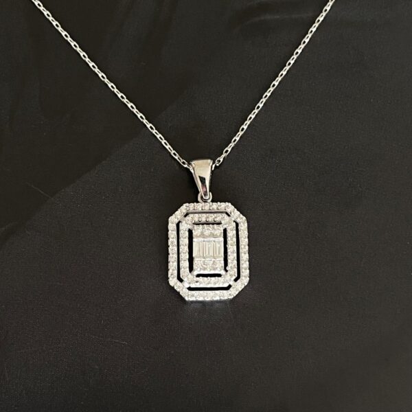 Baget gümüş kolye, modern çizgilerle klasik şıklığı bir araya getiren özel tasarımıyla günlük ve özel gün kombinlerinize sofistike bir dokunuş katar. Parlak baget kesim taşın ışıltısını 925 ayar gümüşün zarafetiyle buluşturan bu kolye, hem minimal hem de dikkat çekici bir görünüm sunar.