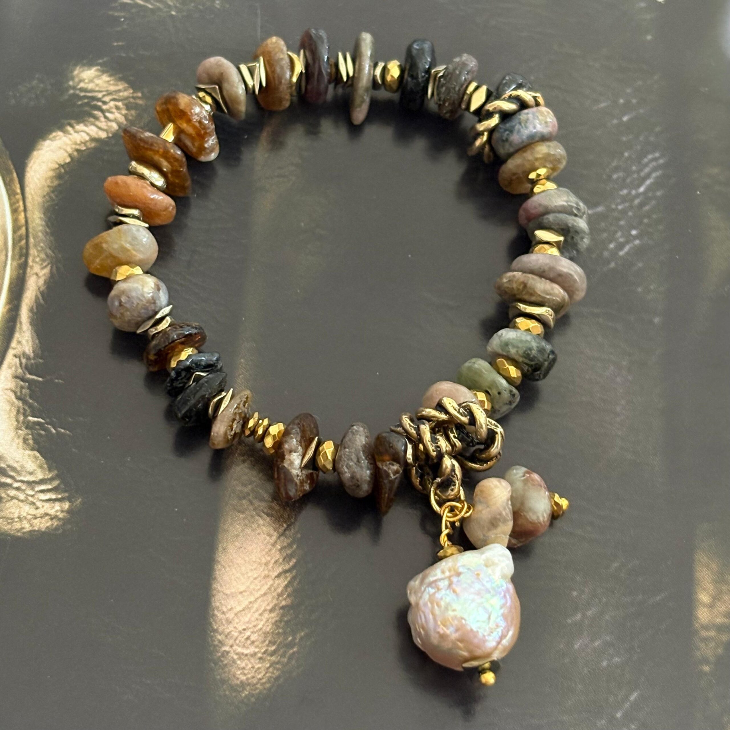 Bu özel tasarım bileklikte kullanılan doğal taşlar, doğadan gelen sıcak toprak tonlarıyla dikkat çeker. Taşlar arasında kahverengi, gri ve yeşil tonlarında turmalin görünümlü doğal taşlar, doğal dokulu kesimleriyle her bilekliğe benzersiz bir karakter kazandırır. Doğal taşların enerjisiyle tasarlanan bu bileklik, stilinize hem doğal hem de zarif bir dokunuş katar. Bilekliğin merkezinde yer alan barok inci detayı ise tasarıma şık ve modern bir vurgu ekler.