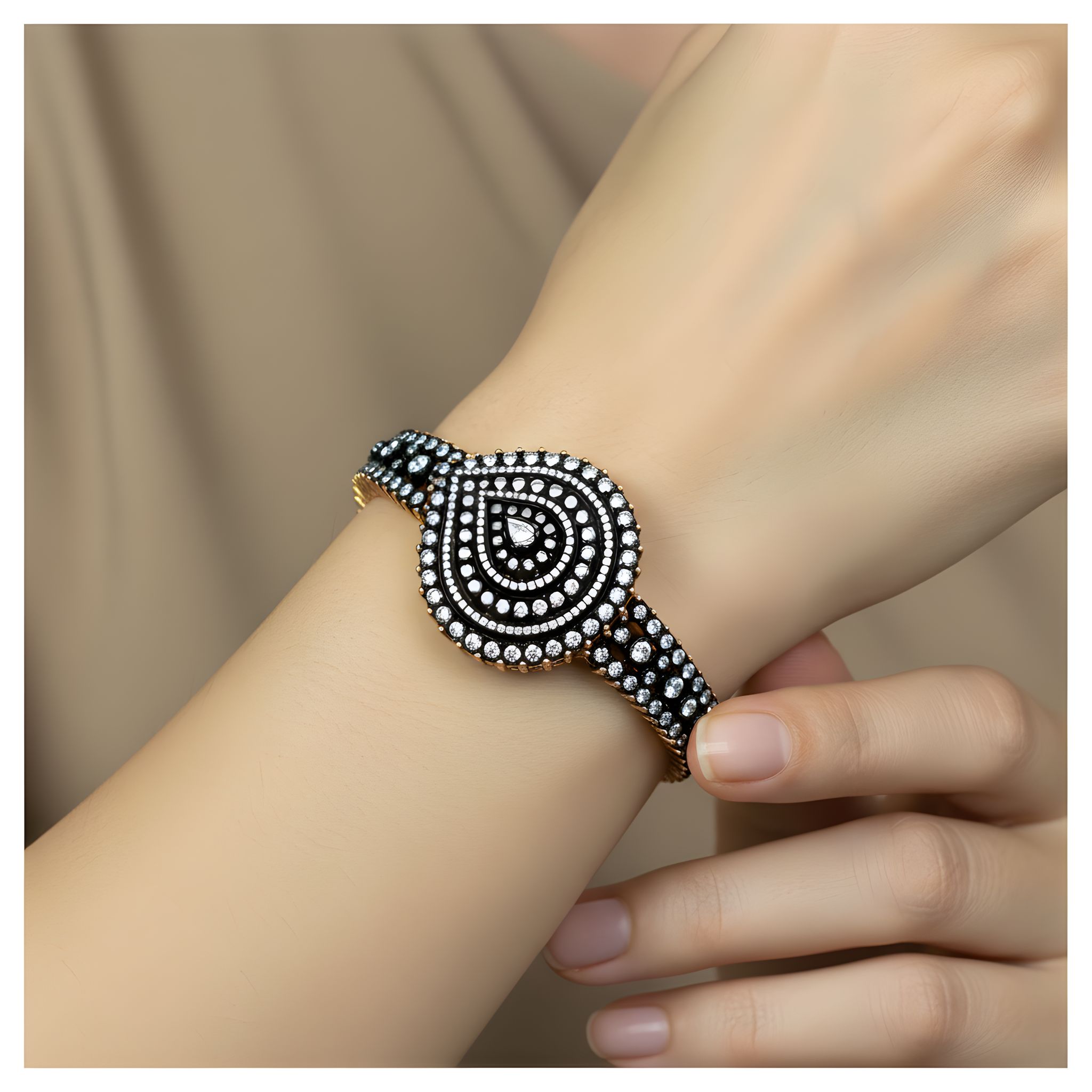 925 ayar gümüşten üretilen bu kelepçe bilezik, elmas montür taş detaylarıyla dikkat çeker.