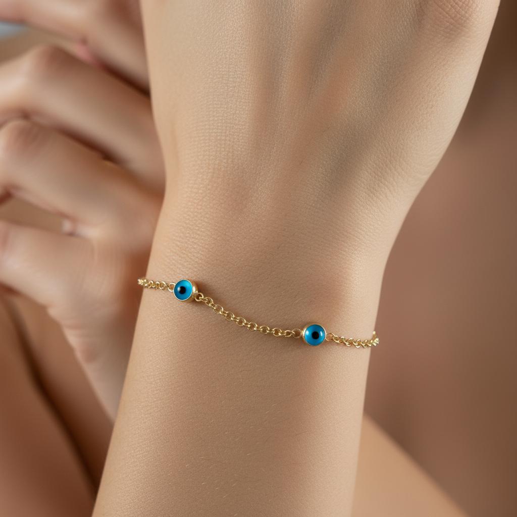 Bu göz figürlü bileklik, her bilekte göz alıcı bir duruş sağlar ve hem minimal hem de dikkat çekici takı sevenler için idealdir.