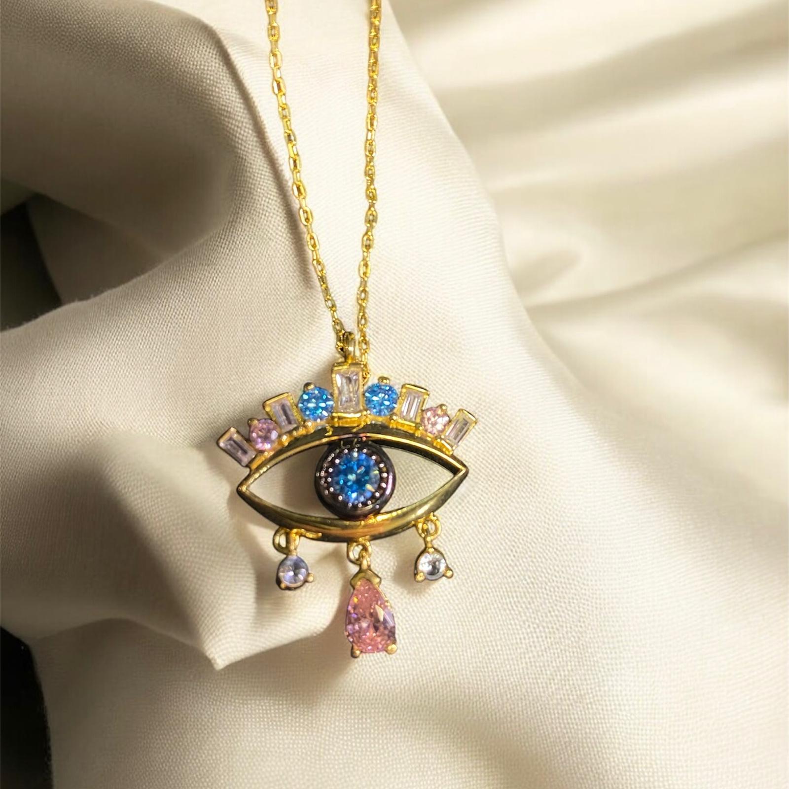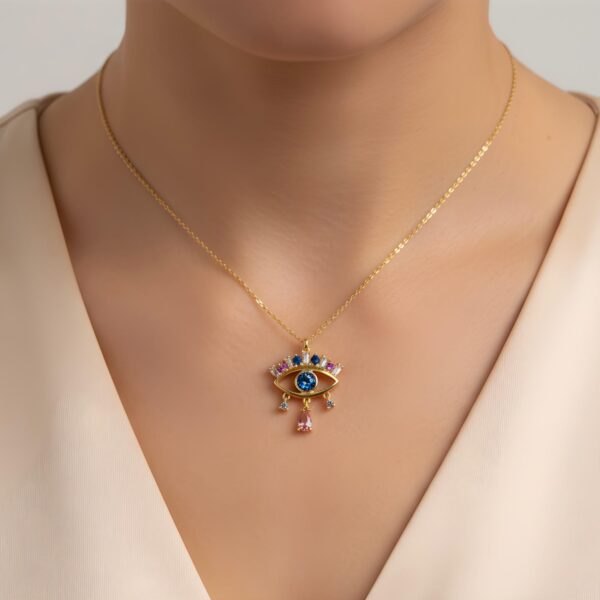 Mavi Göz Baget Taşlı Renkli Gold Gümüş Kolye, zarafeti ve enerjiyi bir araya getiren modern bir takı seçeneğidir.