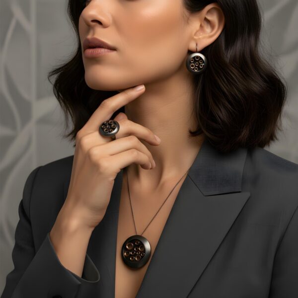 Mat siyah zemin üzerine yerleştirilen bronz tonlu detaylar, sete karakteristik ve etnik bir hava kazandırırken, kullanılan 925 ayar gümüş uzun ömürlü ve dayanıklı bir kullanım sağlar. Her bir parça benzersizdir ve el işçiliği nedeniyle küçük farklılıklar içerir; bu da ürünü tamamen özgün ve otantik kılar.