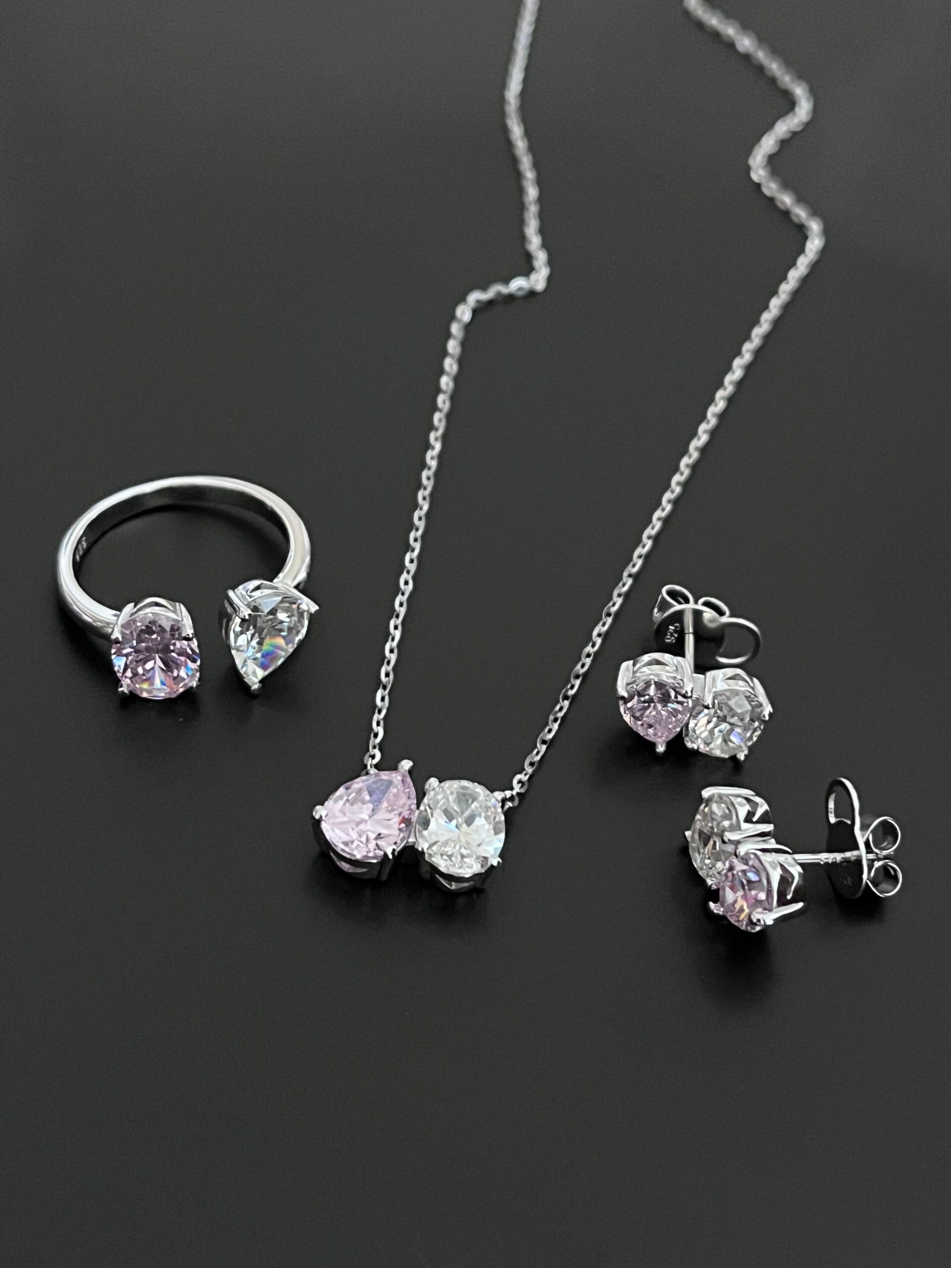 Pembe Beyaz Taşlı Gümüş Set (Kolye,Küpe, Yüzük)