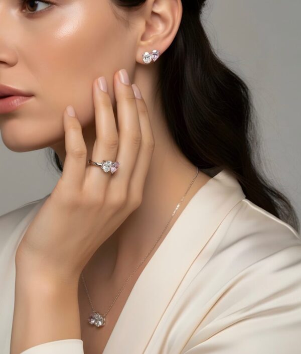 Zarif ve modern tasarımıyla dikkat çeken bu taşlı gümüş set, kolye, küpe ve yüzükten oluşan şık bir kombin sunar. 925 ayar gümüş takı seti, biri pembe diğeri beyaz tonlarda olan parlak taş detaylarıyla feminen ve ışıltılı bir görünüm kazandırır. Minimal ve zamansız tasarımı sayesinde hem günlük kullanımda hem de özel günlerde şıklığınızı tamamlar.