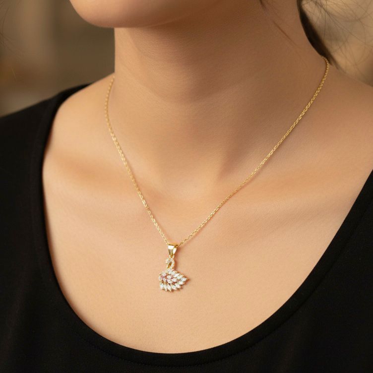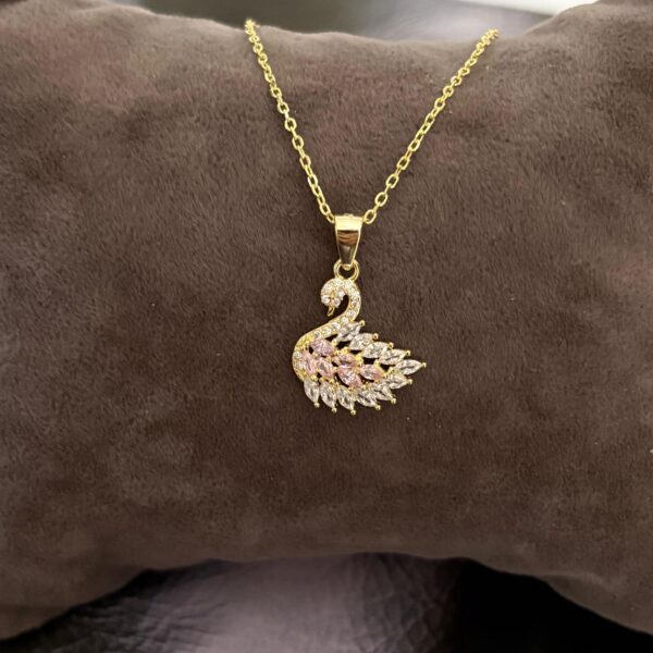 Pembe Taşlı Zarif Işıltılı Gold Kuğu Gümüş Kolye