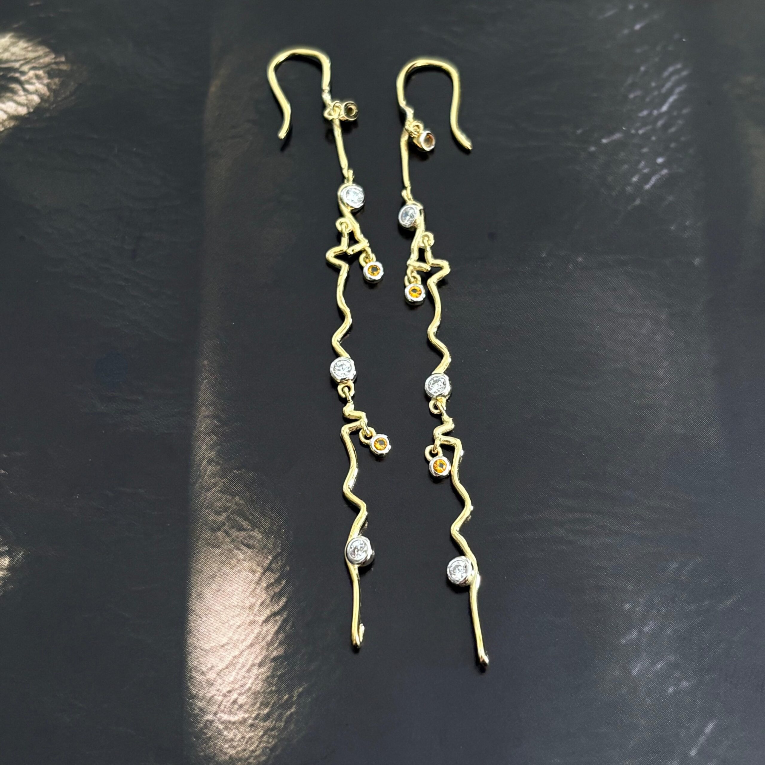 Şıklığı minimal dokunuşlarla tamamlayan bu taş detaylı gold kaplama gümüş sallantılı küpe, 925 ayar gümüş üzerine altın kaplama ile üretilmiştir. İnce ve dalgalı formu sayesinde modern bir görünüm sunarken, üzerindeki parlak taş detayları küpeye zarif bir ışıltı katar. Günlük kullanımdan özel davetlere kadar her kombinle uyum sağlayan bu şık gümüş küpe, hafif yapısı sayesinde konforlu kullanım sunar.